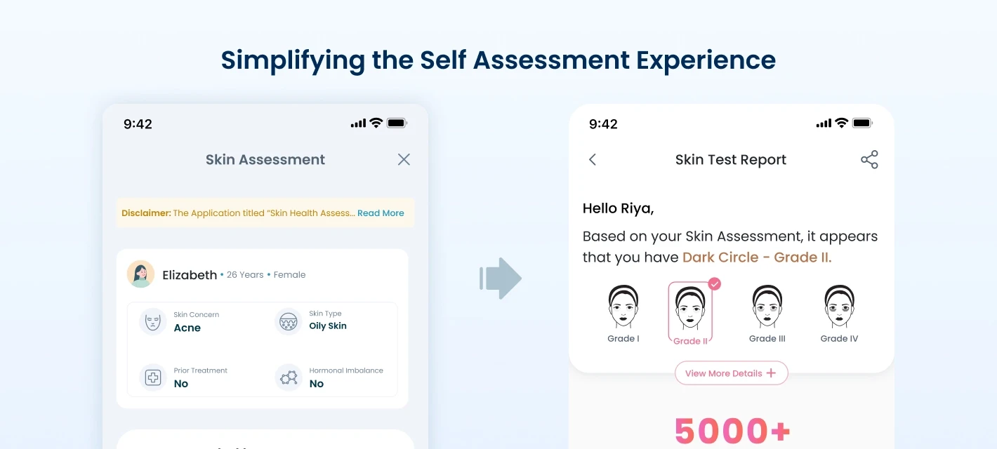 We designed a Self-Assessment flow to personalize recommendations, used by 10L+ users with a 5%+ conversion rate—exceeding industry standards. New UI components and a custom filtering system enhanced navigation, while trust badges, free dermatologist consultations, and in-depth assessments built credibility.